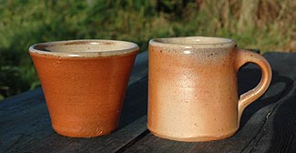 Firing the pots in the kiln is an exhausting process lasting between 55 and 85 hours, day and night. The wood-fuelled kiln needs stoking every ten minutes – two friends help out - and the temperature should be a constant 1350 degrees Centigrade. Wood ash melts the silica in the clay to make glass which forms the shiny glaze. Granite gives a toasted colour, from toffee brown to reds, according to the heat and the amount of oxygen. The glaze inside the pots is in shades of greengage.
