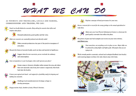 In June 2007 Common Ground launched a campaign to create a new climate of expectation for souvenirs. We will be challenging tourism chiefs to facilitate the production and sale of authentic artefacts and edible goods, and designers, colleges and producers to make imaginative, place-inspired artefacts of which we can be proud. We shall work with the Crafts Council, Regional Arts Councils, educational, cultural, heritage and tourism agencies as well as the media to reach new audiences.